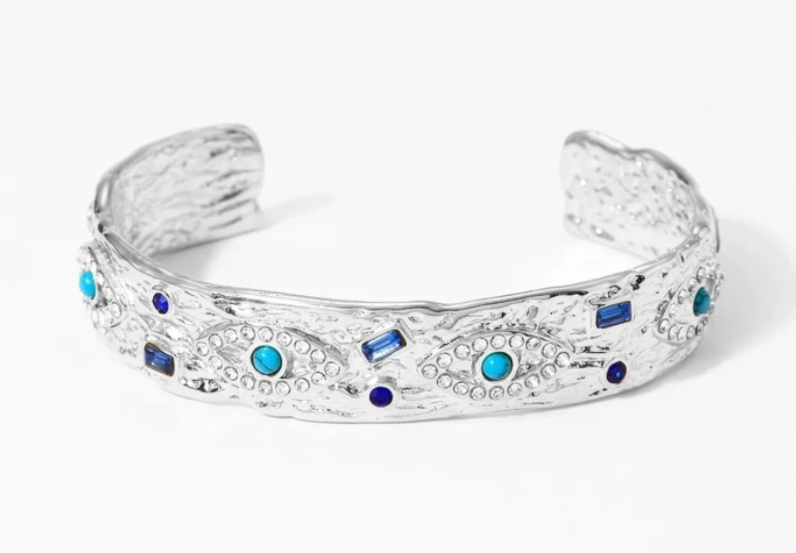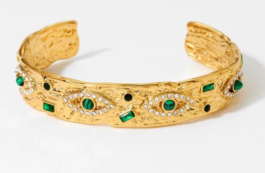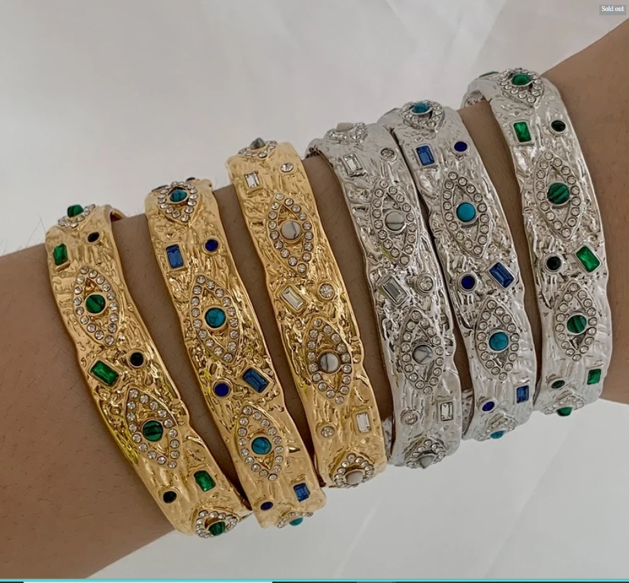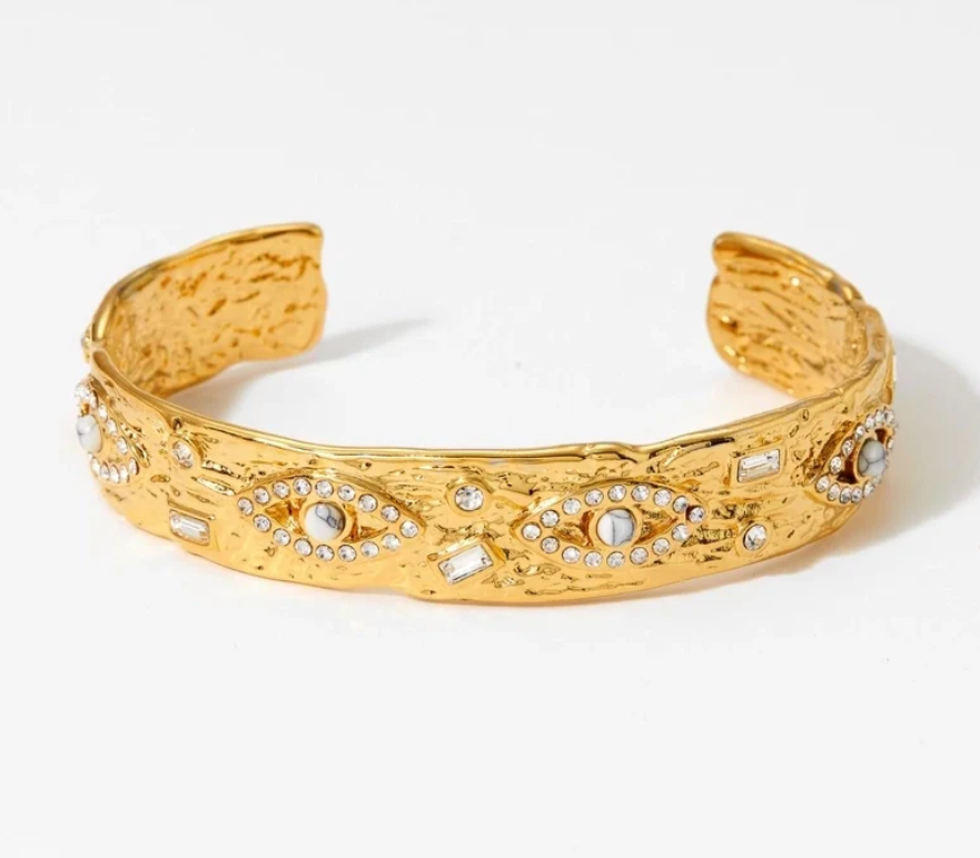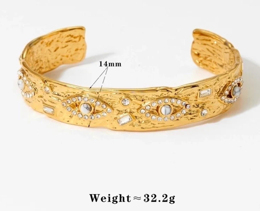 Il bracciale della linea MARRAKECH combina il resistente acciaio inossidabile 304 con un'elegante placcatura sottovuoto in oro 18 K o oro bianco per una lucentezza duratura. Caratterizzato da un caratteristico motivo a occhio di diavolo intarsiato con zirconi scintillanti, offre uno stile raffinato ma casual. Leggero (38 g), questo bracciale monopezzo bilancia la semplicità con la maestria artigianale, rendendolo un accessorio versatile per le donne che cercano una sottile raffinatezza.
