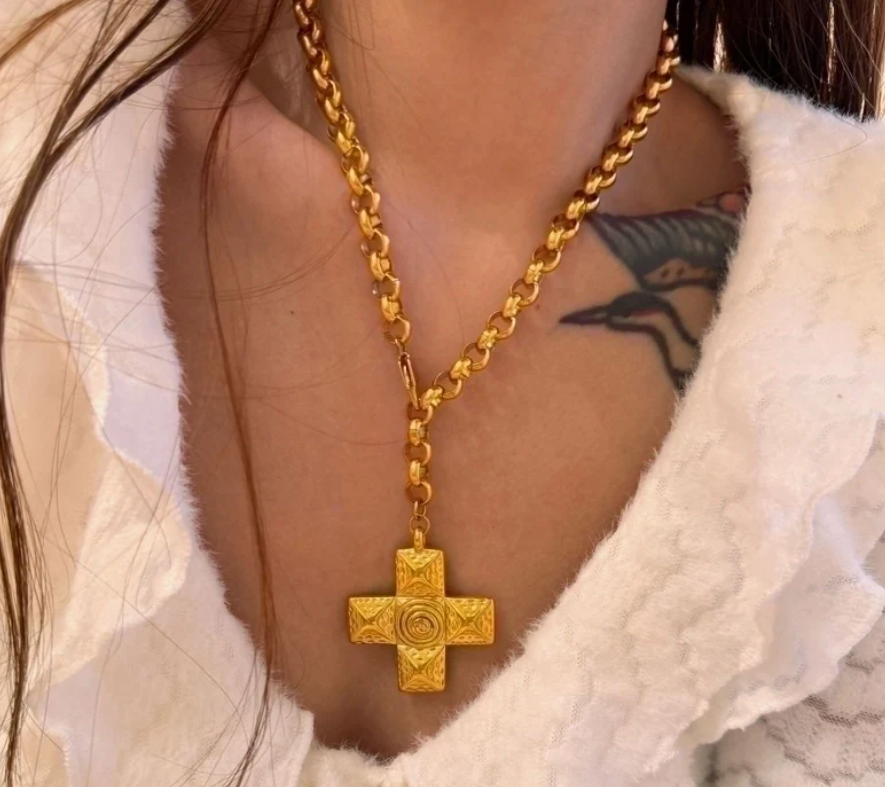 Questa collana con ciondolo, della linea RETRO' GOLD, combina un classico motivo a croce con un'estetica retrò, realizzata in acciaio al titanio per una maggiore durata. La placcatura in oro 18 carati aggiunge una finitura lussuosa che resiste all'ossidazione, rendendola ideale per l'uso quotidiano e la moda di strada. Con un peso di 61 grammi, offre una sensazione consistente senza compromettere il comfort, proponendosi come un accessorio raffinato che valorizza qualsiasi outfit.