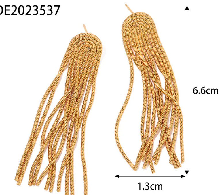 Questi orecchini presentano un design geometrico raffinato. Realizzati in acciaio inossidabile, sono impreziositi da un motivo a nappa e rifiniti con una placcatura in oro 18 K tramite galvanica. Le dimensioni compatte di 15 cm per 15 cm per 2 cm li rendono un accessorio elegante e distintivo.