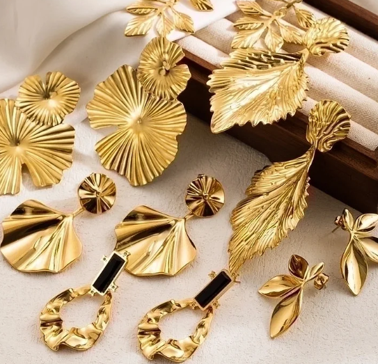 Questi orecchini pendenti in acciaio inossidabile 304 sono rifiniti con una placcatura in oro 18k ottenuta tramite processo sotto vuoto, garantendo durata e lucentezza nel tempo. Il design sofisticato include motivi a fiore, foglia di ginkgo e altre foglie, perfetti per un uso quotidiano elegante e discreto. Leggeri e ipoallergenici, combinano stile raffinato e comfort per un accessorio versatile dedicato alla donna moderna.